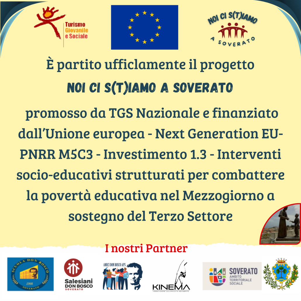 Il progetto è promosso da TGS Nazionale ed è finanziato dall’Unione europea – Next Generation EU- PNRR M5C3 – Investimento 1.3 – Interventi socio-educativi strutturati per combattere la povertà educativa nel Mezzogiorno a sostegno del Terzo Settore.